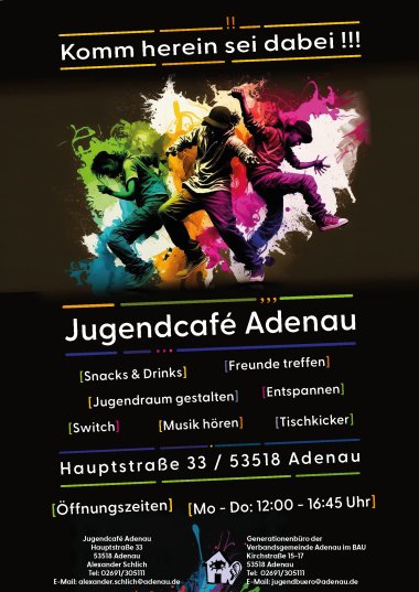 Die Verbandsgemeindeverwaltung Adenau bietet einen Zugang zum Internet im öffentlichen Jugend-Café an. Mit einem drahtlosen Gerät haben Sie über das WLAN des Jugend-Café kostenlosen Zugang zum Internet.