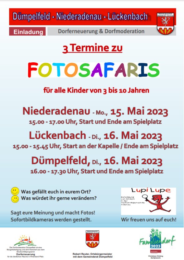 Im Rahmen der Dorfmoderation und des Familiendorf 2023 fanden am Montag, den 15. Mai und Dienstag, den 16. Mai 2023 eine Fotosafari und Lupi Lupe in Dümpelfeld, Niederadenau und Lückenbach statt.
