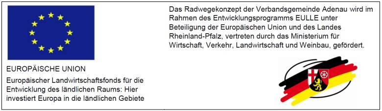 Durch die Erstellung des Radwegekonzeptes leistet die Verbandsgemeinde Adenau eine Grundvoraussetzung für mögliche spätere Fördermaßnahmen. Nur wenn Radrouten in einem Konzept dargestellt sind, besteht die Möglichkeit eine Förderung für Radwegebau oder begleitende Maßnahmen wie Beschilderung in Anspruch zu nehmen.